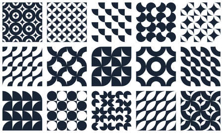 Abstract vector geometric seamless patterns set, black and white simple geometric elements repeat tiles, wallpapers or website backgrounds, design background in retro style.