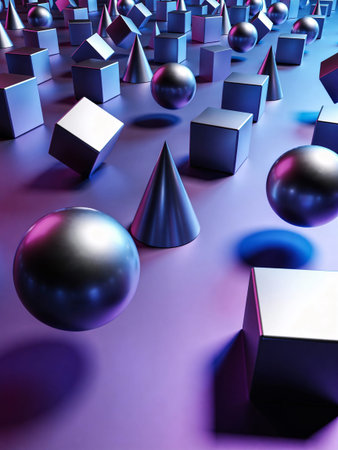 Abstract 3d rendering of geometric shapes. Cubes, hexagons, pyramids, squares and spheres.