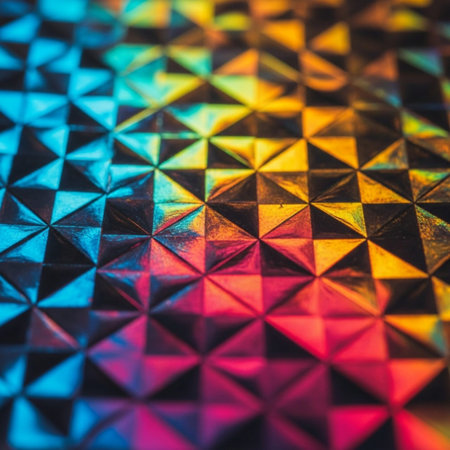 Extreme macro view of iridescent, angular holographic security foil, showing vibrant color shift and geometric microstructure. Abstract optics and material science.