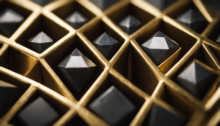 This close-up presents a detailed view of dark, faceted gemstones, possibly obsidian or black diamonds, neatly arranged within a grid of gold compartments. Each gem is precisely cut with sharp facets that catch the light, creating subtle highlights. The gold grid, with its warm metallic sheen, forms a structured and framework, dividing the space into individual cells. The shallow depth of field blurs the background and the edges of the grid, focusing attention on the texture and geometric...