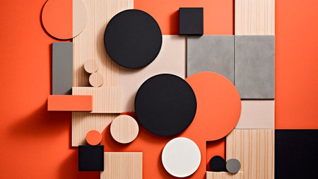 Colorful geometric shapes on orange, black and gray background. Minimal style.