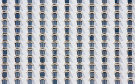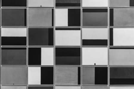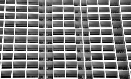 A black and white image of rows and columns of windows and balconies in a generic modern apartment block.