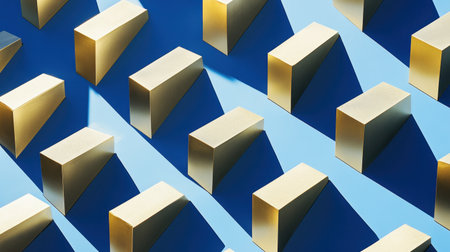This captivating abstract image showcases golden blocks arranged in a meticulous pattern, casting striking shadows on a vibrant blue surface. Ideal for artistic projects.