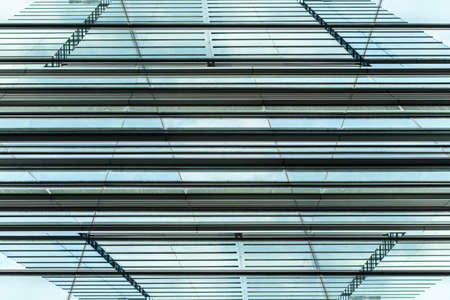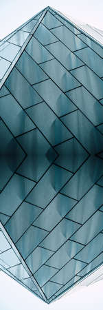 underside panoramic and perspective view to steel blue glass high rise building skyscrapers, business concept of successful industrial architecture