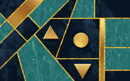 Abstract geometric 3d illustration with green and blue marble and golden elements
