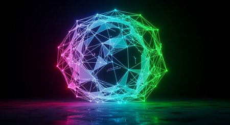 Glowing neon polygonal sphere with lines and dots on dark background 3D rendering