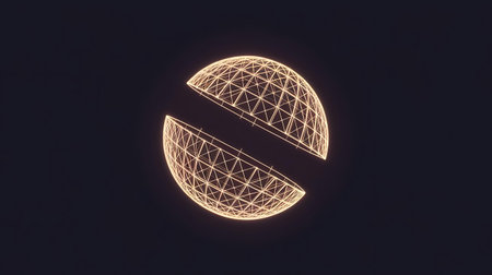 showcases a complex geodesic dome structure rendered in 3D. The structure is composed of a dense network of interconnected geometric lines and vertices, forming a detailed wireframe. The edges of the structure are outlined with glowing neon light, alternating between a bright yellow and a vibrant purple. The dark background helps to accentuate the luminous lines and the intricate geometric pattern of the dome. The overall impression is futuristic and technologically advanced.