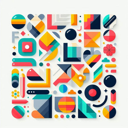 Bold geometric shapes in a modern abstract pattern, featuring circles, squares, and triangles. Ideal for digital design and creative projects.