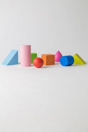Wooden geometric shapes colorful toy figures composition on white background. Top view