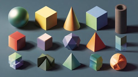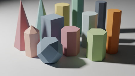 This image showcases a diverse assortment of 3D geometric shapes in various pastel colors, including spheres, cubes, pyramids, and other polyhedrons, arranged in a visually appealing manner, ideal for educational purposes and children's learning activities.