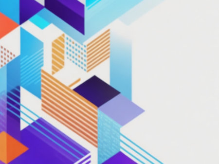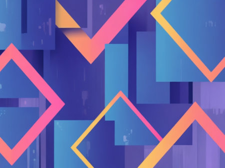 A colorful abstract background with a yellow circle in the middle. The circle is surrounded by squares and triangles. The background is full of different shapes and colors, creating a dynamic