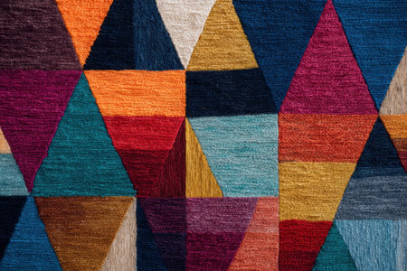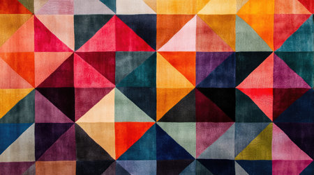 Close up view of a vibrant carpet showcasing a seamless pattern of equilateral triangles in various colors, forming a visually appealing geometric design