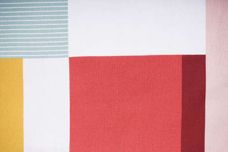 A colorful geometric design created with various fabrics, highlighting texture and pattern in a fashion setting.
