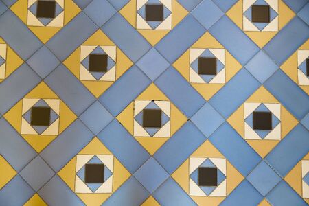 Colorful abstract tiles in blue, orange and yellow color scheme on the building wall with vibrant geometric patterns