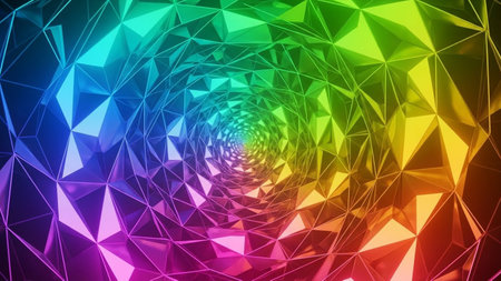 An abstract, colorful geometric tunnel formed by a rainbow-colored wireframe structure creates a mesmerizing vortex effect against a dark background.