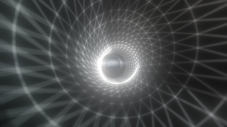 Bright white digital tunnel with geometric mesh structure creating a futuristic glowing path.