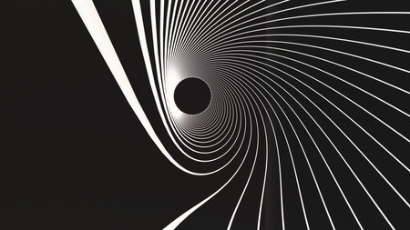 Dynamic abstract spiral featuring alternating black and white stripes creating a hypnotic tunnel effect with depth and motion.