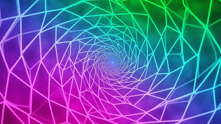 A colorful geometric spiral tunnel with a gradient of purple, pink, blue, and green, set against a starry nebula background.