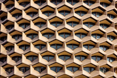 A tall brick building with lots of windows and brutalism zig zag hoog detail. AI generated, AI generative, AI generativ.