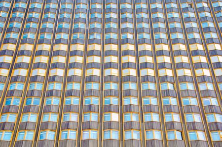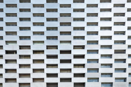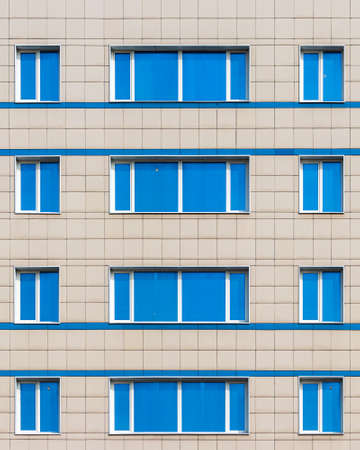 Minimalist facade of modern office building with square Windows. Frontal view of the facade of building with a lot of windows with people staying at home during quarantine.