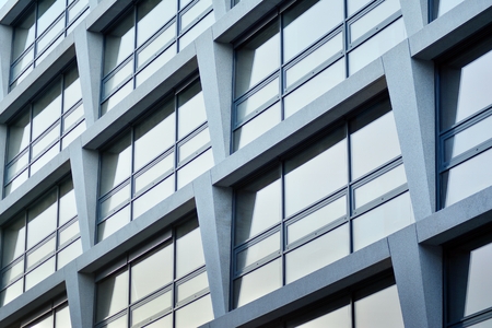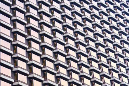 perspective view of geometric angular concrete windows on the facade of a modernist 1960s brutalist style building