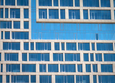 The facade of a skyscraper. Office building of a business center. Blue glass windows background.