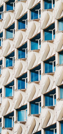 This structure features a repetitive pattern of windows in a contemporary design highlighting clean lines and a minimalist aesthetic.