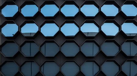 Office buildings. Structure of hexagon windows in futuristic technology network connection concept. Blue glass modern architecture facade design with reflection of sky in urban city, Downtown.