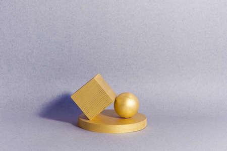 Golden podiums displays on a lilac background. Stands in the form of a cube, a ball and a cylinder. Scenes for cosmetic product presentation. Studio minimal, template, mockup for advertising