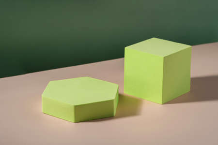 Podium pedestal for cosmetic product packaging on green background. Showcase for jewellery presentation, monochrome platform for perfume advertising, cosmetics stand background, branding scene mockup