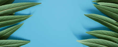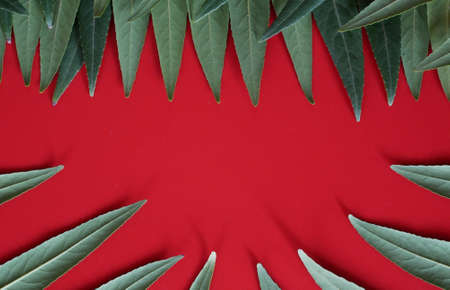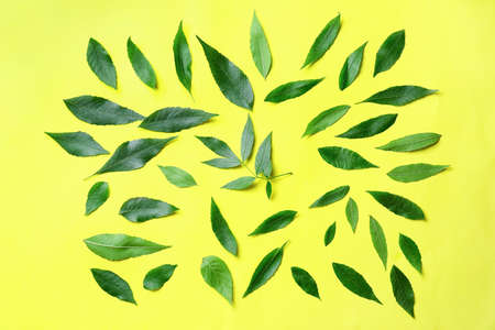 Frame for text made of fresh green leaves, isolated on green background, creative minimalism.