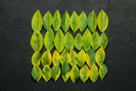 White spotted green leaves in dark background, pattern photography, light and shade, top view