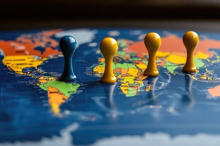 Colorful game pieces on world map depicting global strategy and travel concepts.
