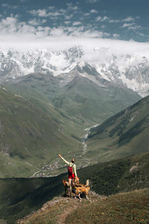 Young active girls hiking in Greater Caucasus mountains with dogs, Svaneti region, Mestia district, Svaneti, Georgia