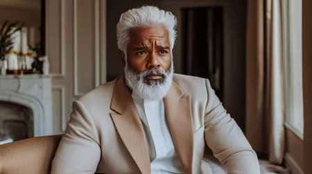 A contemplative mature man with distinguished silver hair and a white shirt on a neutral beige background