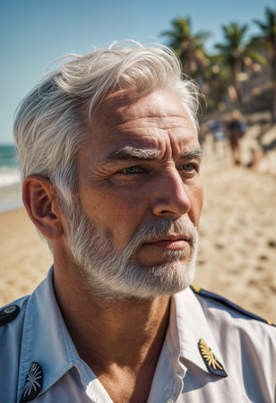A man with white hair and beard wearing a uniform looks out at the beach. Generative AI