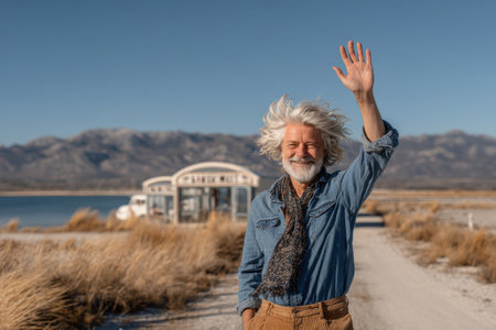 Elderly man with gray hair is waving cheerfully by a scenic lakeside, surrounded by tall grass and mountains, creating a joyful atmosphere.