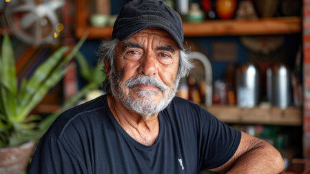 A mature man with gray hair and a beard sits calmly by a window, exuding warmth and kindness. His relaxed expression suggests contentment and inviting energy in a cozy environment.