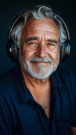 Elderly man enjoying music with headphones on, against a simple dark backdrop, clean and modern aesthetic