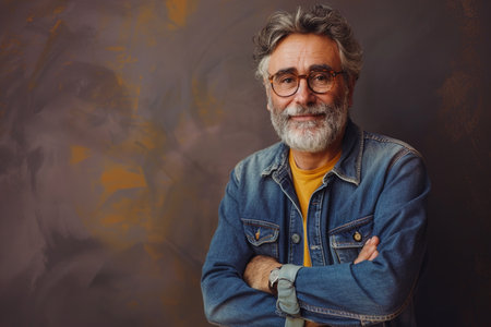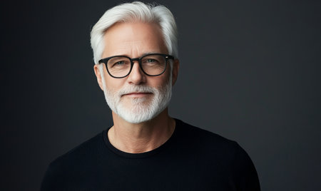 A senior man with gray hair and a well groomed beard wears black glasses and a black shirt. He exhibits a confident smile, creating a warm and approachable atmosphere in a studio setup.