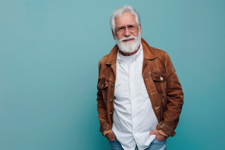 Stylish elderly man with white beard and orange glasses relaxing in a colorful outfit, exuding confidence and eccentric charm.