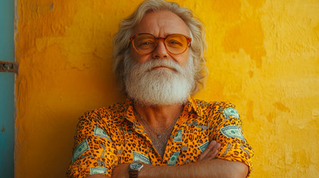 An elegant elderly man with a well-groomed beard stands confidently with arms crossed, wearing stylish sunglasses and a trendy outfit. The colorful floral mural behind him adds a lively and artistic touch, enhancing the overall charm and sophistication of the scene.