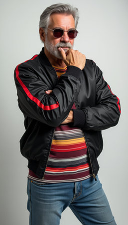 A stylish senior man with gray hair and sunglasses poses confidently in a black bomber jacket and striped shirt. His relaxed demeanor and thoughtful expression exude charisma and charm, showcasing a modern take on classic fashion.