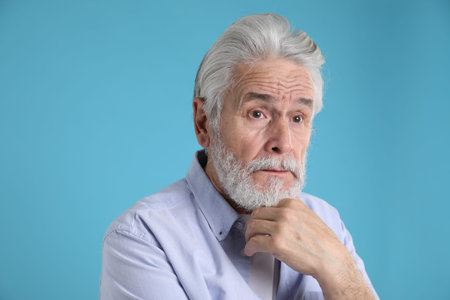 Amnesia. Senior man trying to remember something on light blue background