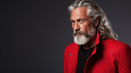 Portrait of mature man with gray long hair and beard in red jacket on dark background