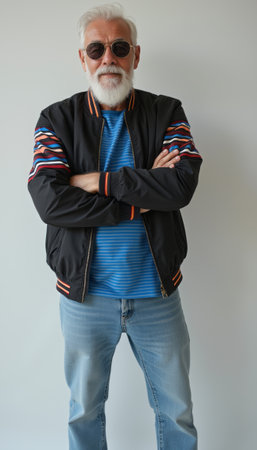 An elderly man stands confidently with his arms crossed, wearing stylish sunglasses and a vibrant striped jacket over a blue striped shirt. His fashionable look exudes charisma and a sense of modernity, showcasing how age can blend effortlessly with contemporary style.
