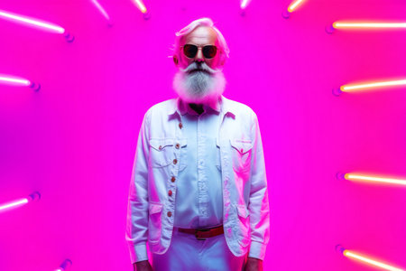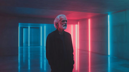 Portrait of a 70-year-old man with silver hair and a beard, standing in a futuristic hallway illuminated by blue and pink neon lights. The modern setting creates a dramatic and introspective mood.