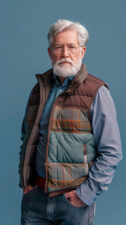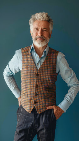 Fashionable stylish modern senior man in a shirt and vest against a blue wall