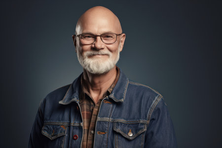 Portrait of a bald senior man in a denim jacket and eyeglasses.