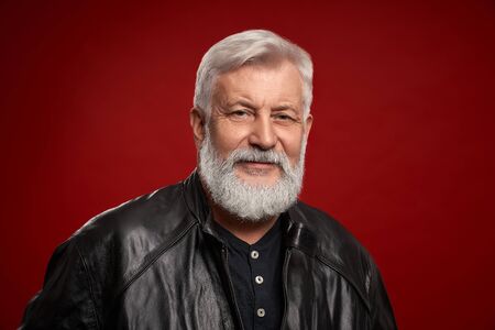 Portrait of confident aged man with grey beard and hairstyle in black sweater and leather jacket posing in studio with red background. Concept of the value of years and great experience.